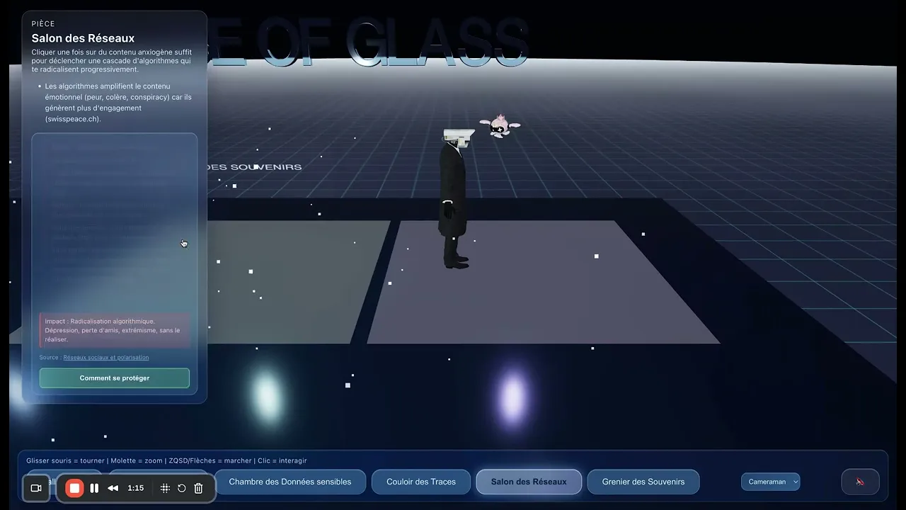 By placing the user inside a fragile, fully visible environment, the project highlights how personal data is constantly accessible, often without awareness or consent. The aim is not to scare, but to encourage reflection and critical thinking about digital habits.
